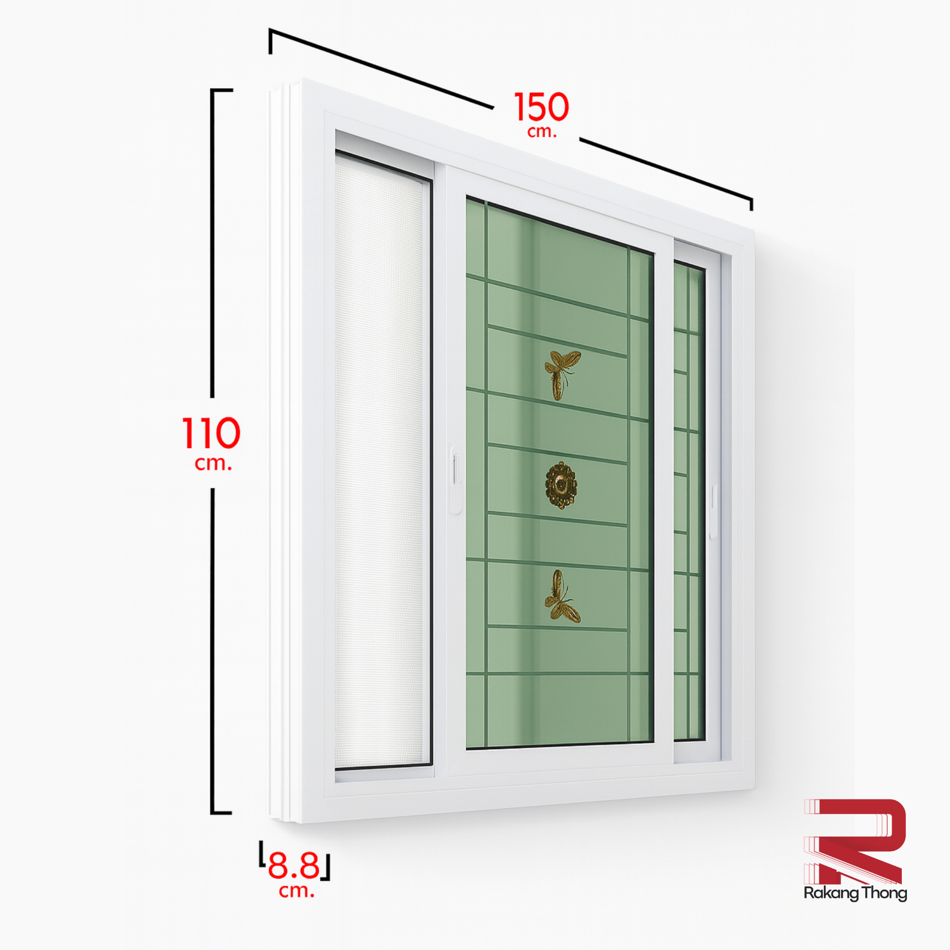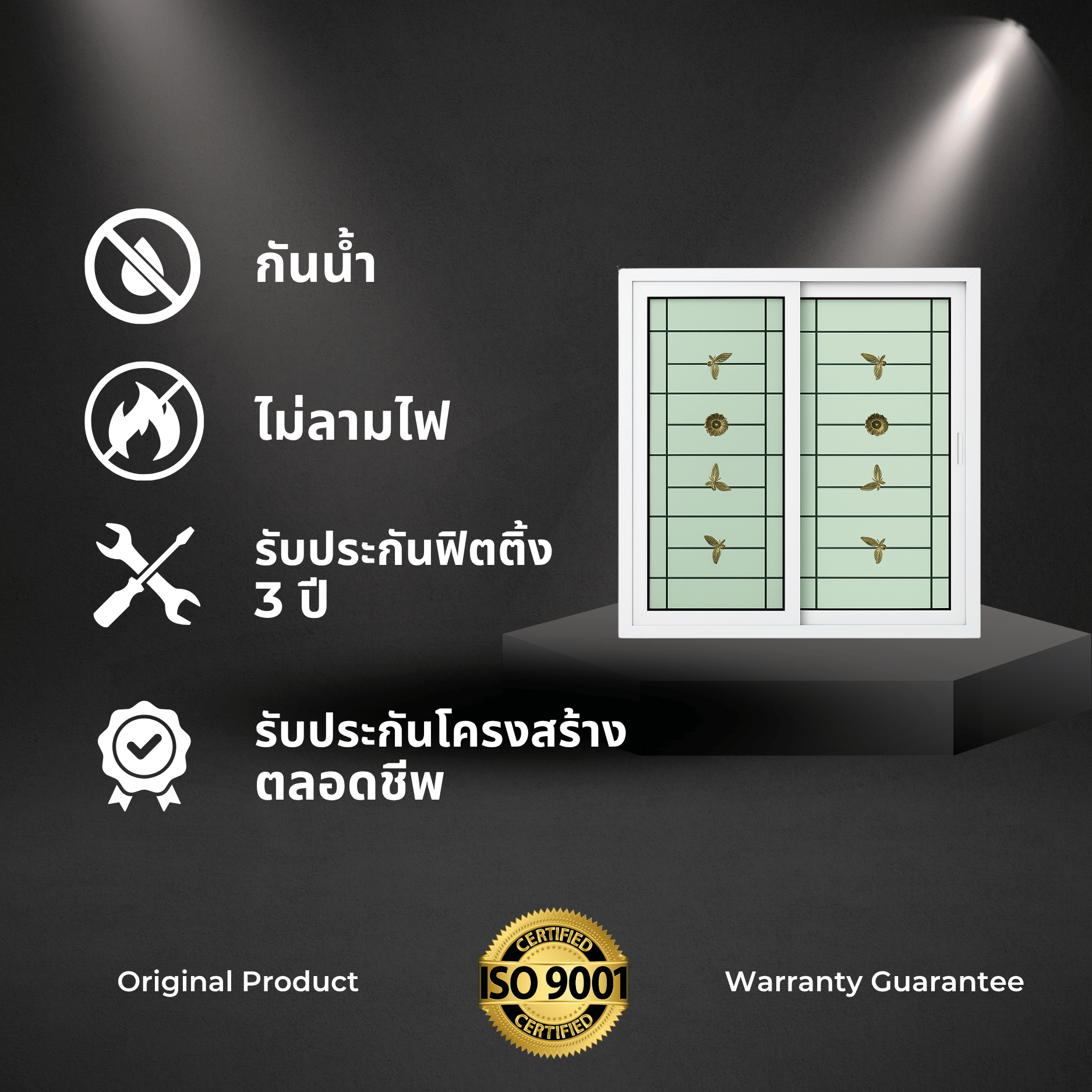 ขนาด 150x110 CM. กระจกสีเขียวใสตัดแสง 2 ชั้น ป้องกันแสงแดดและรังสียูวี พร้อมป้องกันเสียงรบกวนจากภายนอก เหล็กดัดตรงกลางป้องกันการโจรกรรมได้ถึง 100%